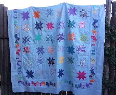 I think it took longer to lay out the blocks and decide how to cut them than piece the blocks. The instructions are clear and it all pieced together perfectly. There are a couple of different versions included in the pattern. I used version 2 for the star blocks (solid stars instead of pieced center blocks). My version has two different size stars. For the pieced border, I cut the strips the same width and grouped the strips by color (similar to Thelma's version). I can't wait to get this one to a longarm quilter to finish up.