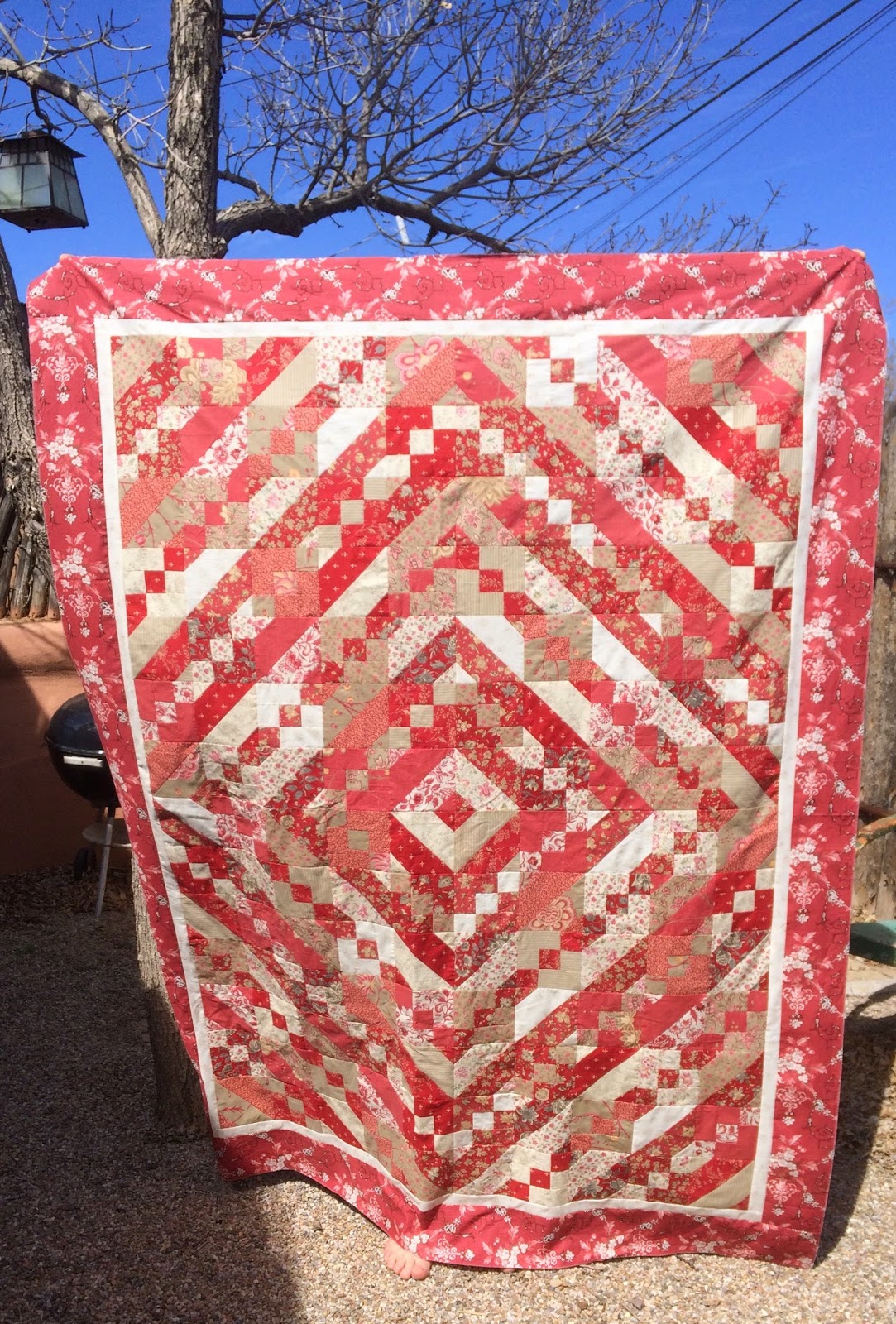 I just love this quilt and I'm waiting for some backing fabric to arrive to finish it up. It's always windy in Santa Fe so it's difficult to get a good photo (if you look close Mr. SBQ's toes are peeking out but don't tell him. Also it was warm enough for bare feet here yesterday and I am sorry if it is cold where you are still).