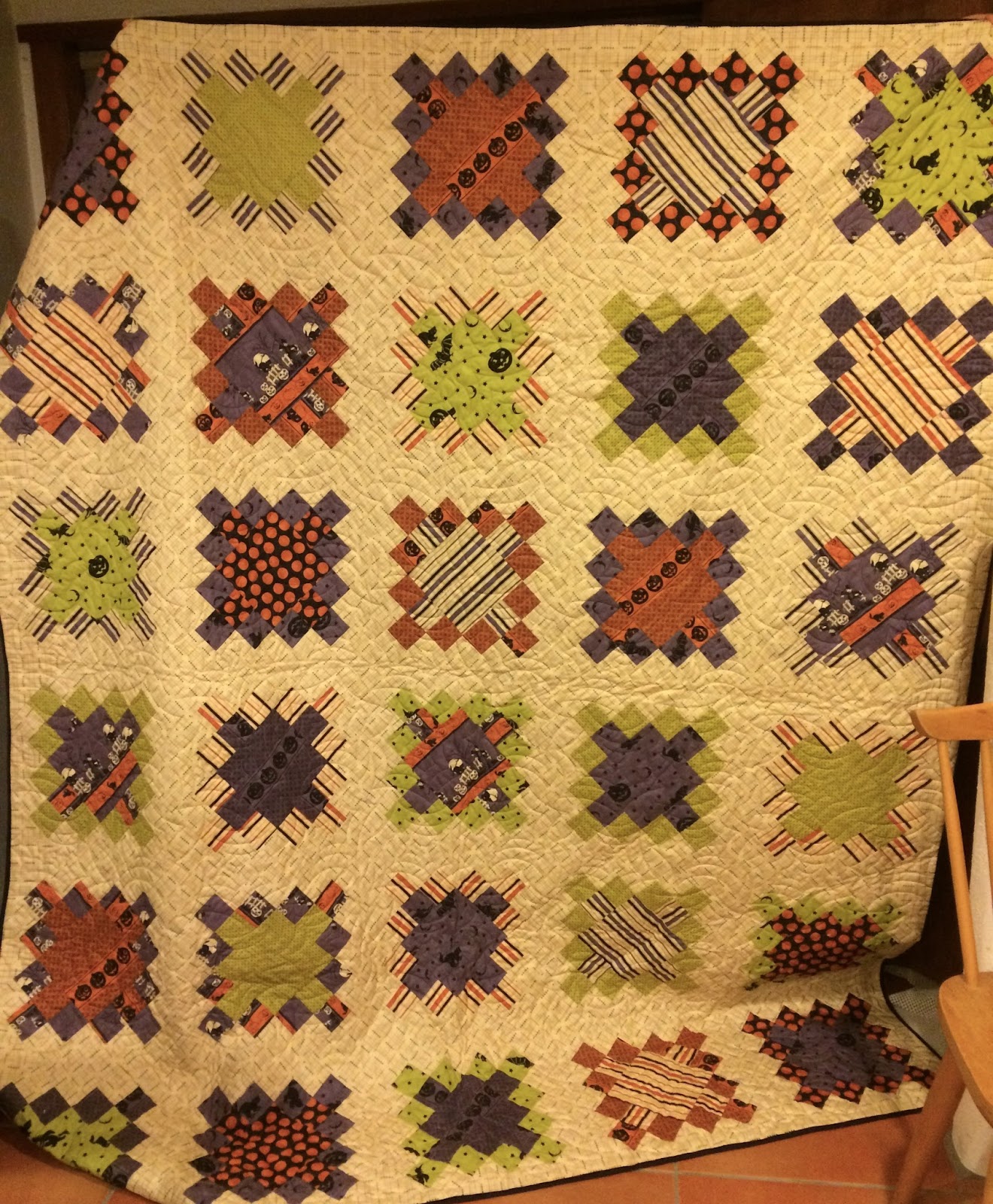Voila! Halloween Night fabric by Minick & Simpson and the pattern is Lilypads in the book Time Out Quilts by Atkinson Designs. The color is a little to yellow because I took this at night when Mr. Quilt Holder was able to be a quilt holder.